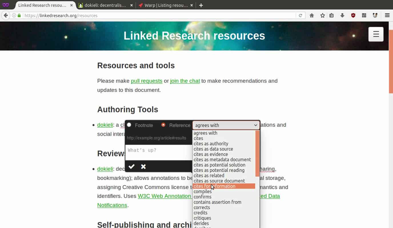 I ask Sarven about dokieli’s relationship to the Solid project. “I was welcomed to the Solid research group by Tim Berners-Lee and dokieli came about from my previous Web experiments. There was a good fit between the two projects as I was using what was being developed in Solid, its tooling, technology, and infrastructure. I was trying out advanced approaches, to figure out what’s not standardized, and to see how far we can take tooling that is purely based on open Web standards. dokieli can interact with Solid-compliant servers.” During that year, Sarven worked on Linked Data Notifications (LDN), a W3C recommendation of the Social Web Working Group, which was implemented and exemplified as part of dokieli and Solid, as well as thoroughly tested and written up as a peer-reviewed (and award-winning) academic paper “Linked Data Notifications: A Resource-Centric Communication Protocol” (Capadisli 2016) for the Extended Semantic Web Conference. dokieli and LDN also work well alongside other W3C recommendations like Web Annotation Protocol, ActivityPub, and the Linked Data Platform.