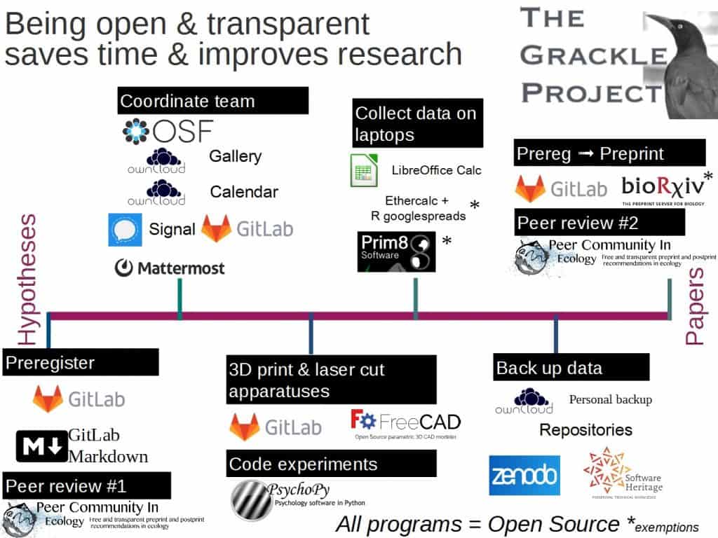 Image: Before – After. ‘Being open & transparent saves time & improves research: The Grackle Project’ and ‘Making a ‘Pre-Publishing’ Research Workflow Open Source’ modification of slide 25 from keynote presentation from the 13th Munin Conference (Tromsø, Norway) by Dr. Corina Logan, “We won’t be… ‘Bullied into Bad Science'”, 28.11.2018, https://osf.io/sy9f7/ | See section ‘Failing to make the complete workflow Open Source’ for annotations