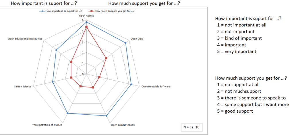 Q1: How important is support for: Open Access, Open Data, Open/reusable software, Open Lab/Notebook, Preregistration of studies, Citizen Science. (Added later): Open Peer Review?