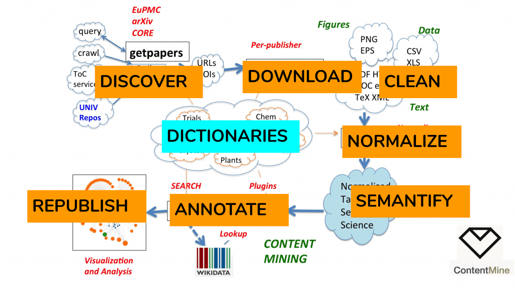 The project uses a software framework called ContentMine as a foundation for data mining, interfacing Wikidata to add semantic enrichment, and a variety of other frameworks for dedicated tasks. The technology is being rapidly developed and is designed to be put in the hands of the public, but also serves a variety purposes for a wide set of communities: research repositories looking to service clients, or researchers needing to speed-up scoping on literature reviews.