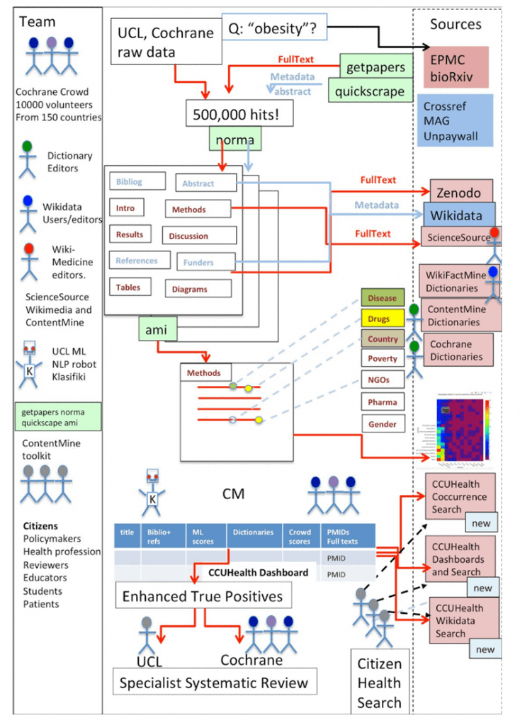 The software is still in an alpha stage, but moving forward at speed with development and documentation being added on a daily basis, all of which is able to happen because of years of work put in by Peter Murray-Rust, the ContentMine team, and collaborators. At some stage UIs will be able to be put in place for general use of the framework and methods by the public. Ideas for the application have already be worked out and below is a schematic of an health knowledge application that was made as a funding proposal ‘bioRxiv in Citizen Health Search (CHS)’ to traverse a variety of knowledge sources EuropePMC, bioRxiv and emerging community sources such as Crossref, unpaywall, Zenodo, and Wikidata and which illustrates the potential value as a ‘Citizen Dashboard’.