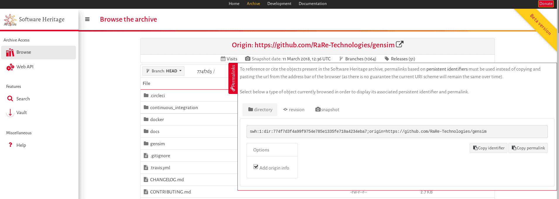 These identifiers are guaranteed to remain stable over time, and are resolved with a persistent identifier schema directly on https://archive.softwareheritage.org/<swh-id>, described in the persistent identifiers documentation. To access the persistent identifiers a permalinks box is available on a side tab and provides identifiers for the current directory, revision (a commit on a particular branch) or snapshot (the complete set of branches in a version control system):